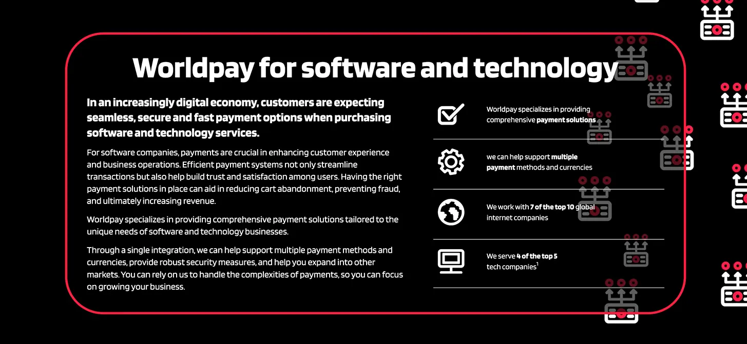 Worldpay specializes in providing comprehensive payment solutions tailored to the unique needs of software and technology businesses.